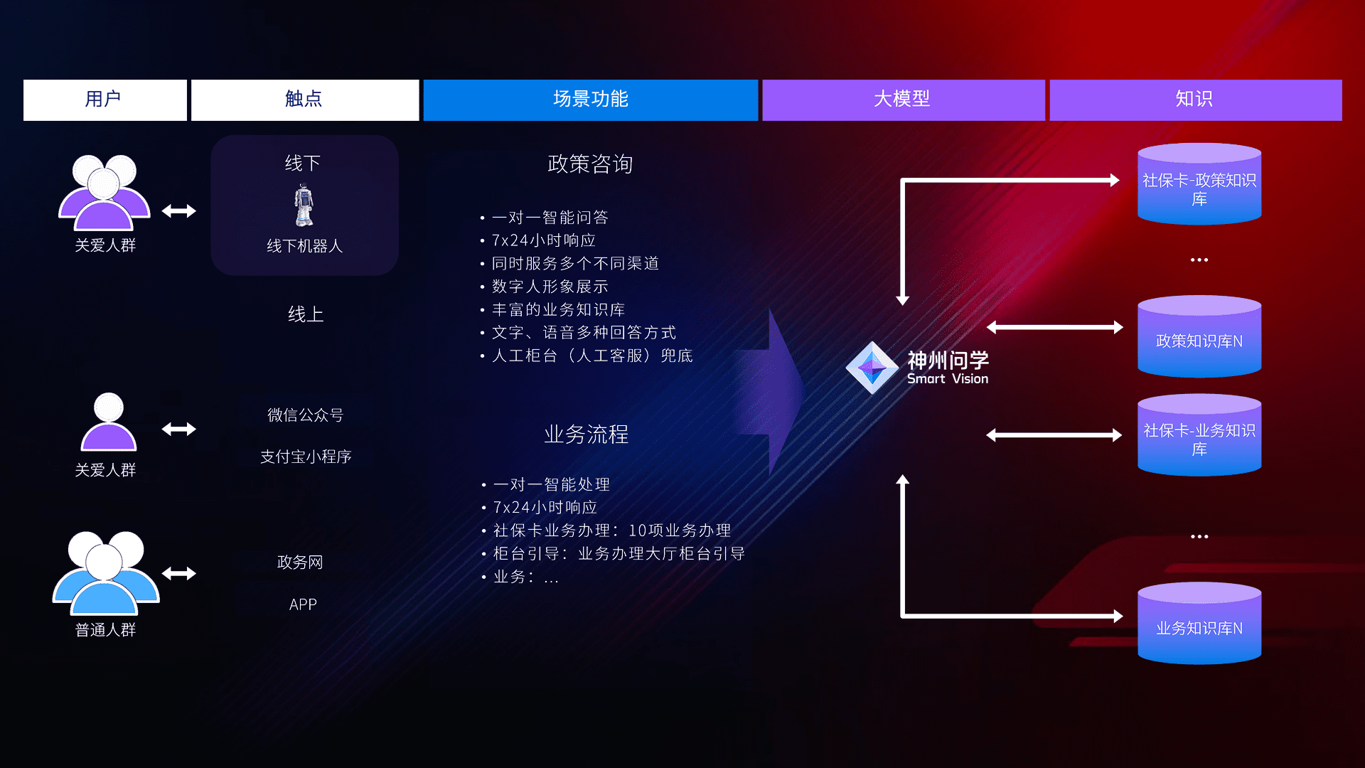 • 线上线下全覆盖:线上提供微信公众号、、、、支付宝小程序、、、、政务网、、、、app多种渠道,,,,与线下机器人形成完整服务体系。。。